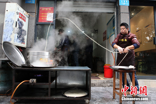 图为师傅将面条向天空抛去,空中划出起伏的弧线,最高离地约两三米,最后面条稳稳落入沸腾的大锅灶内。中新社发 钟欣 摄