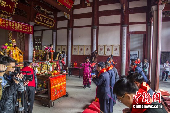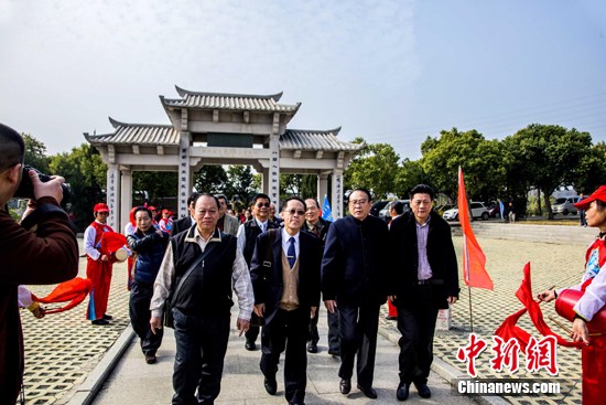 1月19日上午,在福州市莲花山下的闽王纪念馆,来自台湾北部各县市的30位理事长、总干事组成的台湾王氏宗亲理事会共祭先祖“开闽三圣王”:王潮、王审帮、王审知。 中新社发 杨婀娜 摄