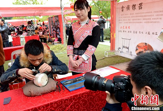 一名福建福安的畲族银器手工制作艺人现场演示绝活。刘可耕 摄