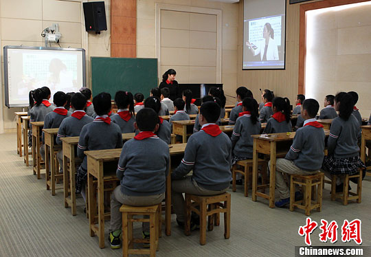 图为同学们在老师带领下观看《开学第一课》法治教育视频。中新社发 周毅 摄