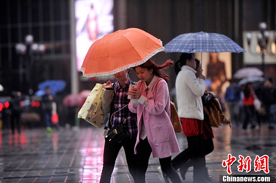 4月7日,重庆解放碑步行街上不少市民身着厚厚的衣服出行。近日,重庆经历强降雨降温天气,从最高温度35摄氏度下滑至最低温度11摄氏度。部分高海拔地区已经开始降雪。