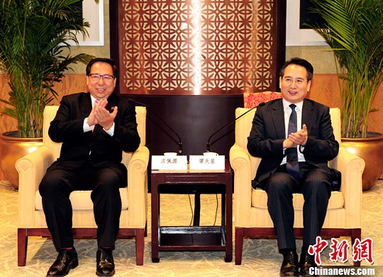 5月18日,国务院侨办副主任谭天星在北京会见以洛杉矶中华总商会会长庄佩源率领的洛杉矶(罗省)中华总商会代表团一行。中新社发 张勤 摄