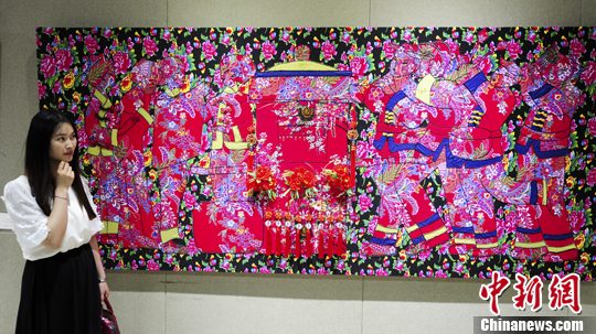 6月3日,山东艺术学院美术学院大学生毕业作品展在济南举行,大学生用“老粗布”创作的“出嫁”画作,吸引时尚女孩模仿画中“新娘”动作拍照。