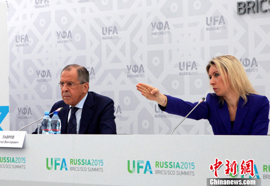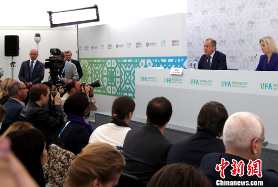 7月9日,俄罗斯外长拉夫罗夫在乌法举行的新闻发布会上表示,美国正在人为制造对俄罗斯的敌意,目的是在俄边境附近建造军事设施。中新社发 王修君 摄