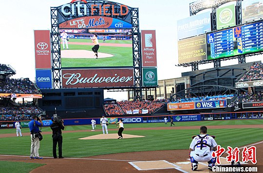 当地时间7月25日晚,中国驻纽约领事馆总领事章启月,受邀为在可容纳四万多人的纽约大都会棒球队花旗球场的棒球赛开球。2015年第八届“中华之夜”系列活动当晚在纽约大都会棒球队花旗球场拉开帷幕。中新社发 阮煜琳 摄
