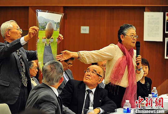 图为与会者介绍各地有关纪念碑(日语称慰灵碑)的现状。中新社发 王健 摄