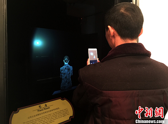 图为全息成像技术还原的宋庆龄演奏现场吸引市民拍照留念。周毅 摄