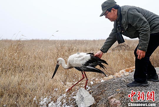 3月4日,滨海新区湿地保护志愿者协会与唐山野生动物保护协会的多名志愿者来到北大港湿地,将一个月前成功救助的一只东方白鹳放飞自然。中新社记者 佟郁 摄