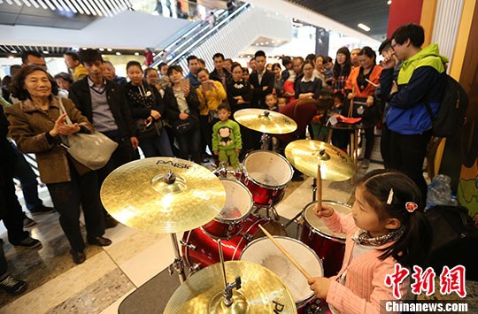 4月4日,一名小女孩在北京的商场中演奏架子鼓《让我们荡起双桨》,她参加的公益活动旨在让民众热爱音乐、热爱生活,唤起民众对自己童年的回忆。
