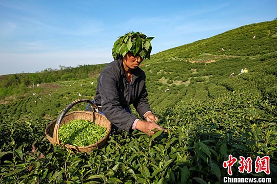 4月4日清明节,贵州省观山湖区百花湖畔神鹊茶场,茶农们纷纷走上茶山,抢摘清明时节“清明茶”,一派繁忙景象。中新社记者 贺俊怡 摄