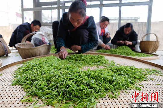 4月4日清明节,茶农精选刚采摘的茶叶。中新社记者 贺俊怡 摄