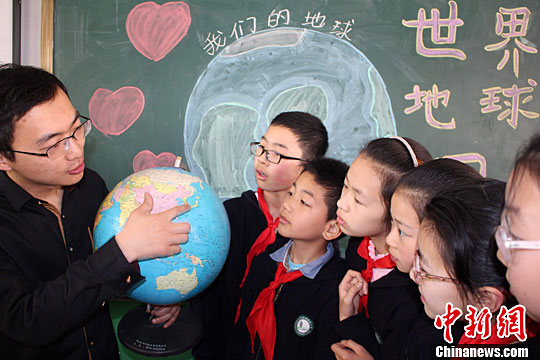 4月19日,老师为学生们讲解地球相关的地理及科普知识。中新社记者 张娅子 摄