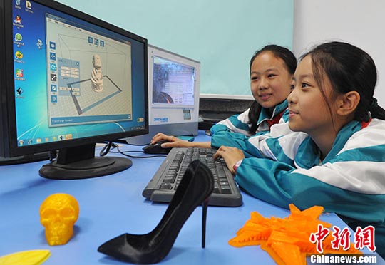 在河北石家庄槐北路小学的3D打印室,小学生们制作了多件3D打印作品。 中新社记者 翟羽佳 摄