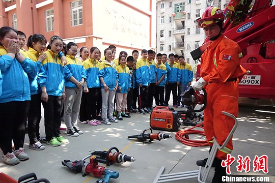5月10日,消防员在为学生们演示消防救援工具。 中新社记者 张娅子 摄
