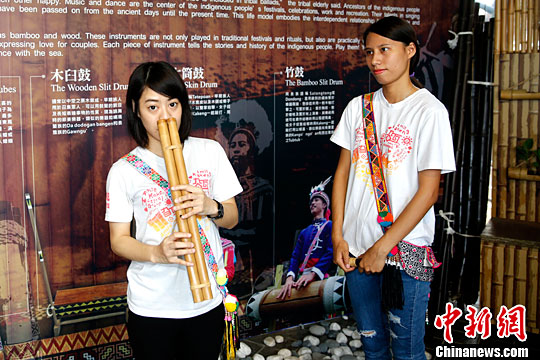 5月27日,位于台北市花博公园的“原民生活美学馆”内,工作人员展示台湾少数民族乐器。中新社记者 陈小愿 摄