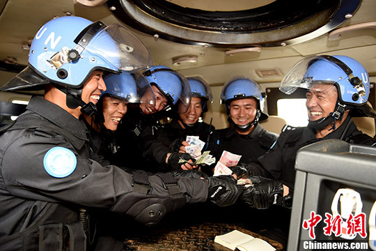 图为中国第四支驻利比里亚维和警察防暴队队员在装甲车上亲手交纳党费。 李金良 摄
