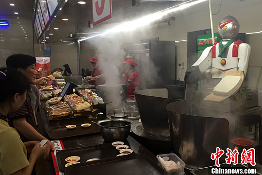 7月13日,湖南长沙一家餐厅内,机器人“奥特曼”有节奏地切着面条下锅,左手端面板,右手拿刀片,引来食客们好奇的目光。中新社记者 泱波 摄