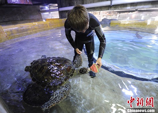 7月17日,长春海洋馆里的海龟、海豹们,惬意地享受着水果、冰块。当日为暑伏节气,饲养员们开始用各种办法帮助可爱的海洋动物们清凉度夏。