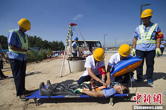 7月26日,山西诚信市政道桥一分公司组织的安全应急救援演练在太原市中心街市政建设工地举行。数百名施工建设者,现场观摩学习如何组织安全救援。