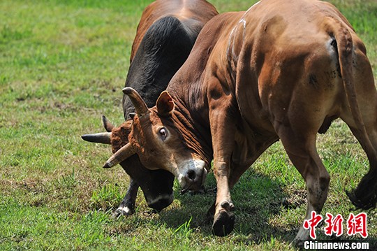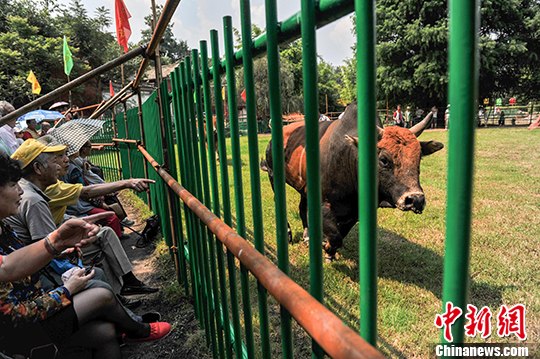 7月26日,昆明云南民族村进行的彝族传统斗牛比赛。每年的农历六月二十四是彝族一年一度的“火把节”,人们聚在一起进行斗牛、摔跤、耍火把等活动,庆祝节日的到来。