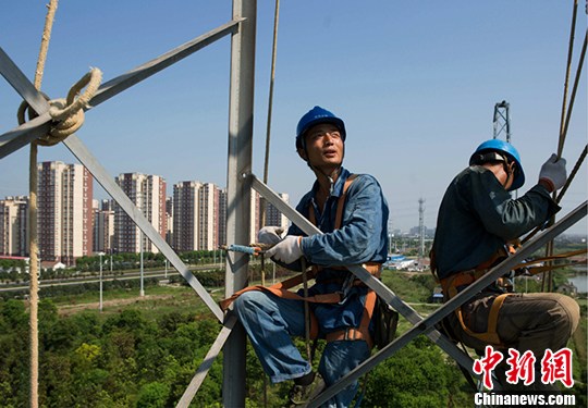 烈日下,杆上作业人员一丝不苟。 奚青兰 摄