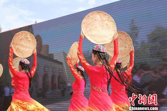8月5日,新疆库车县独创的“大馕舞”在该县比西巴格乡林场村上演。 朱景朝 摄