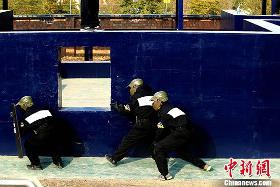 进攻方一名民警观察窗外形势,掩护小组其他民警通过。 杨佳闻 摄