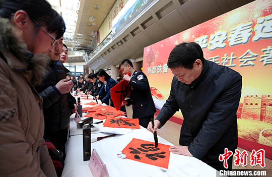 1月11日,北京铁路警方在北京西站开展“平安春运、携手送福”首都铁警书法家携手社会著名书法家为广大旅客送福活动。据全国公安美术家协会副主席李冬介绍,参加此次活动的书法家有中国书法家协会理事、行书专业委员会副主任、总参书法创作院院长王学岭,中国书法家协会会员、中国三峡书院书法研究室主任柴振福,中国书法家协会妇女委员会委员、江苏省镇江市文联副主席阚爱萍,中国书法家协会会员、北京书法家协会理事冷万里,以及来自全国铁路公安文联的6名书法家一起,用书法为广大旅客送上新年的祝福。