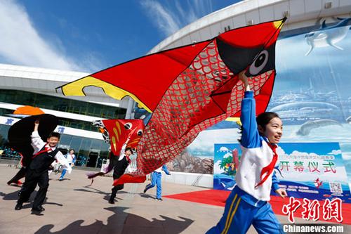 4月1日,以“转动春天·放飞梦想”为主题的”海洋文化踏青季”在北京海洋馆开启,章鱼、大鲸鱼等海洋特色风筝表演、漂浮在空中的悬浮人表演、铜人雕塑、3D科普文化艺术品等各项精彩活动将在踏青季期间轮番亮相。中新社记者 富田 摄
