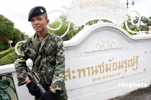 9月25日,泰国士兵在曼谷市区要道持枪警戒。泰国军政府将成立调查小组,调查前总理他信执政时期政府计划有否涉及贪渎。据调查小组发出的声明称,如果他信与其阁员滥用自身权力的罪证确凿,遭指控者的妻子、儿女之资产也将被没收。中新社发 洪少葵 摄