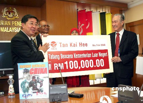 图为大马海鸥集团董事经理陈凯希(图右)在已经代表公司捐款二十万马币之外,今天又个人捐款十万马币,是该国迄今个人捐款之冠。