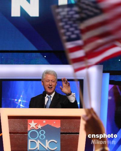 8月27日晚,美国前总统克林顿在美国民主党全国代表大会上演讲,表示支持伊利诺伊州参议员奥巴马竞选总统。中新社发 李静 摄