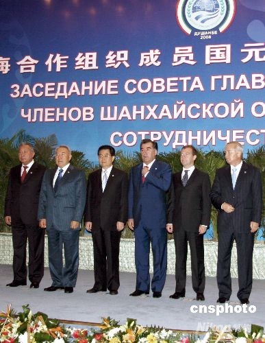 上海合作组织峰会二十八日在塔吉克斯坦首都杜尚别举行,中国国家主席胡锦涛、哈萨克斯坦总统纳扎尔巴耶夫、吉尔吉斯斯坦总统巴基耶夫、俄罗斯总统梅德韦杰夫、塔吉克斯坦总统拉赫蒙、乌兹别克斯坦总统卡里莫夫出席会议。图为六国元首集体合影。中新社发 齐彬 摄