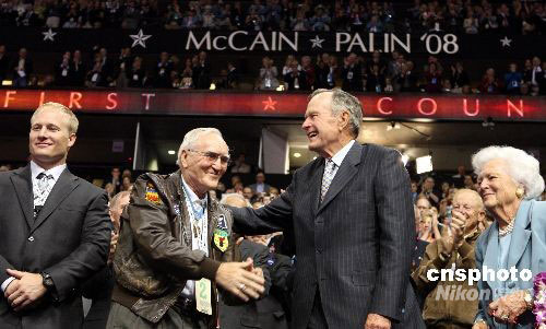 9月2日晚,美国前总统老布什出席在明尼苏达州州府圣保罗举行的共和党全国代表大会。中新社发 李静 摄