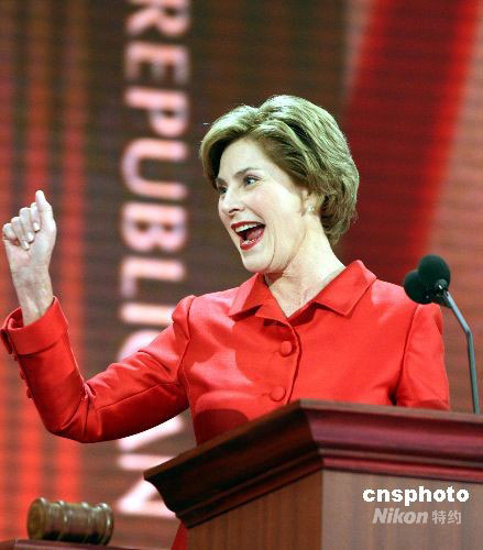 9月2日,美国第一夫人劳拉出席在明尼苏达州州府圣保罗举行的共和党全国代表大会时表示,为阿拉斯加州州长萨拉·佩林有望成为美国历史上第一位女副总统而感到骄傲。中新社发 李静 摄