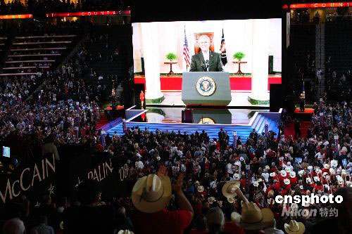 原计划在大会首日发表讲话的美国总统布什,9月2日晚通过视频连线,在华盛顿白宫向在明尼苏达州圣保罗举行的共和党全国代表大会致词。他说,麦凯恩“已经准备好领导这个国家”。中新社发 李静 摄