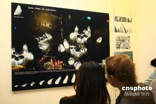 当地时间4日晚,旅英华人设计师举办“四川快递”为主题的概念设计展,为四川地震救灾和灾后重建提供帐篷、简易房等的设计方案。图为观众在观看展出作品。中新社发 李鹏 摄