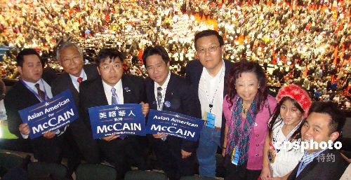 当地时间9月4日,美国共和党全国党代表大会在明尼苏达州圣保罗市举行,与会的共和党华裔代表苏顺国、姚其川、谢宗煌、黄赵企晨等参加大会,支持麦凯恩竞选美国总统。中新社发 卢威 摄