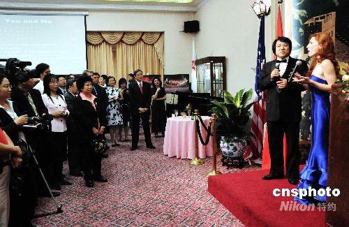 当地时间九月九日,在中国驻美大使馆举行的奥运成功答谢招待会上,北京奥运开幕主题歌《我和你》再度激荡中美各界朋友的内心。图为来自华盛顿著名专业合唱团职业歌唱家用意大利美声唱法为招待会四百余名嘉宾演唱了这首歌曲,赢得了热烈掌声和赞扬。中新社发 邱江波 摄