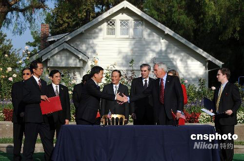 图为中美双方在美国已故总统尼克松出生的小木屋前签署有关协议。
