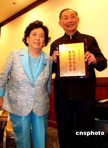 当地时间10月11日,北京京剧院梅兰芳京剧团在美国柯达剧院连续演出2天、上演数场梅派经典京剧好戏:《贵妃醉酒》、《杨门女将》、《白蛇传》、《闹天宫》、《霸王别姬》、《天女散花》等,场场爆满。加州中国表演艺术学院院长徐文缃特向京剧艺术大师梅兰芳之子梅葆玖赠送金匾,以示感谢。 中新社发 卢威 摄