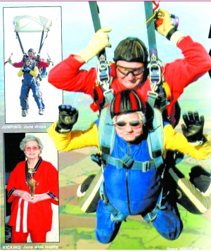 如今83岁的朱恩虽然视力严重退化,几近失明,但她仍然不甘心安分守己地呆在家中。最近,朱恩又来到英国北安普敦郡亨顿市,乘坐一架飞机抵达3000米的高空,玩起了惊险刺激的高空跳伞。这是朱恩一生中进行的首场高空跳伞,她和跳伞教练一起跳下飞机,共乘一顶降落伞安全降落到了地面上。