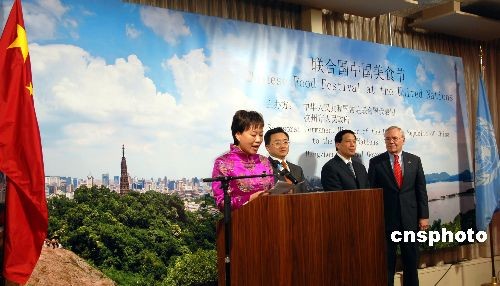 10月20日,由中国常驻联合国代表团、中国浙江杭州市政府联合举办的中国美食节在纽约联合国总部开幕。中国常驻联合国代表张业遂、联合国副秘书长帕斯科、中国常驻联合国副代表刘振民和杭州市副市长佟桂莉出席开幕式。中新社发 李静 摄
