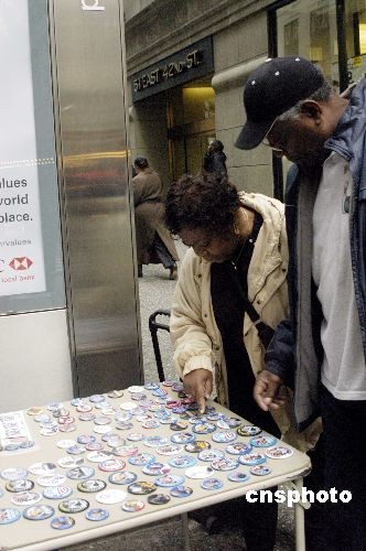 11月3日,美国大选前一天,民众在纽约街头购买印有总统候选人头像的胸章。中新社发 魏晞 摄