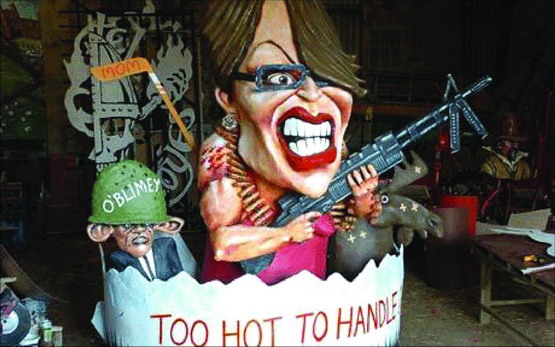 这位阿拉斯加州州长的巨型肖像颇为夸张:她手握一挺机枪,两臂肌肉发达而强健,嘴唇上涂抹着浓艳的口红,还露出了恶作剧式的微笑。她的身边还立着一只美国驼鹿雕塑,身前的标语上写着“烫手山芋”的字样。在佩林雕像的旁边,是民主党总统候选人奥巴马的一个小号雕像,他头戴一顶战斗钢盔,显得大为逊色。尽管下着倾盆大雨,里面填满了烟花的佩林雕像被引爆后,瞬间就炸得灰飞烟灭。