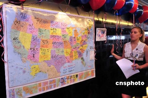 十一月五日,在香港的美国商会举办活动,让居港的美国人士等候大选结果,现场亦公布麦凯恩及奥巴马在各州得票的情况。中新社发 谭达明 摄