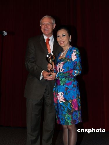 当地时间11月4日,中美电影节在美国洛杉矶好莱坞盛大开幕,1百多部中国和美国电影参加竞选,评选出45部中美电影,再从中选出10部电影,颁发“金天使奖”。中美电影明星齐集好莱坞,1000多人参加。洛杉矶县政委员安东诺奇向香港影视红星汪明荃颁“香港艺人杰出贡献奖”。中新社发 卢威 摄
