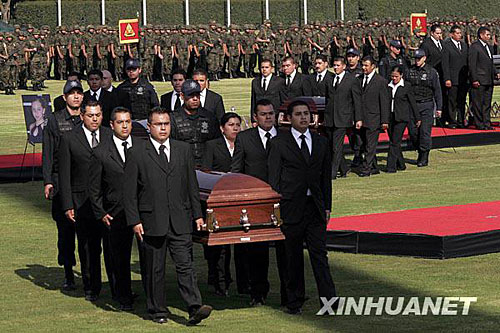 11月6日,墨西哥政府在墨西哥城的一座军营为4日坠机事故遇难者举行隆重葬礼。墨西哥一架小型飞机4日晚在墨西哥城市中心坠毁,包括墨西哥原内政部长胡安·卡米洛·莫里尼奥等多人遇难。新华社发(波尔·孔德雷拉斯摄)