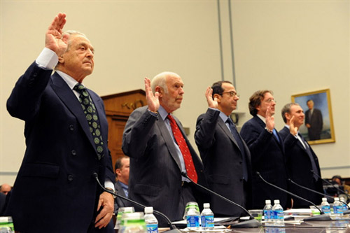 为弄清金融危机发生的原因,寻找“对症下药”的政策措施,美国国会在11月13日聆讯5名久负盛名的对冲基金经理人,调查这5名经理人在金融危机中所起的作用。按照国会的要求,这5名经理人向美国会监管和政府改革委员会作证。这5名经理人去年收入均超过了10亿美元,其中包括赫赫有名的乔治·索罗斯。