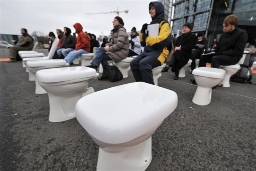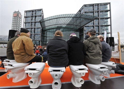 11月19日,在德国柏林的中央车站外,一批关心卫生问题的人士坐在马桶上召开一个小型会议。